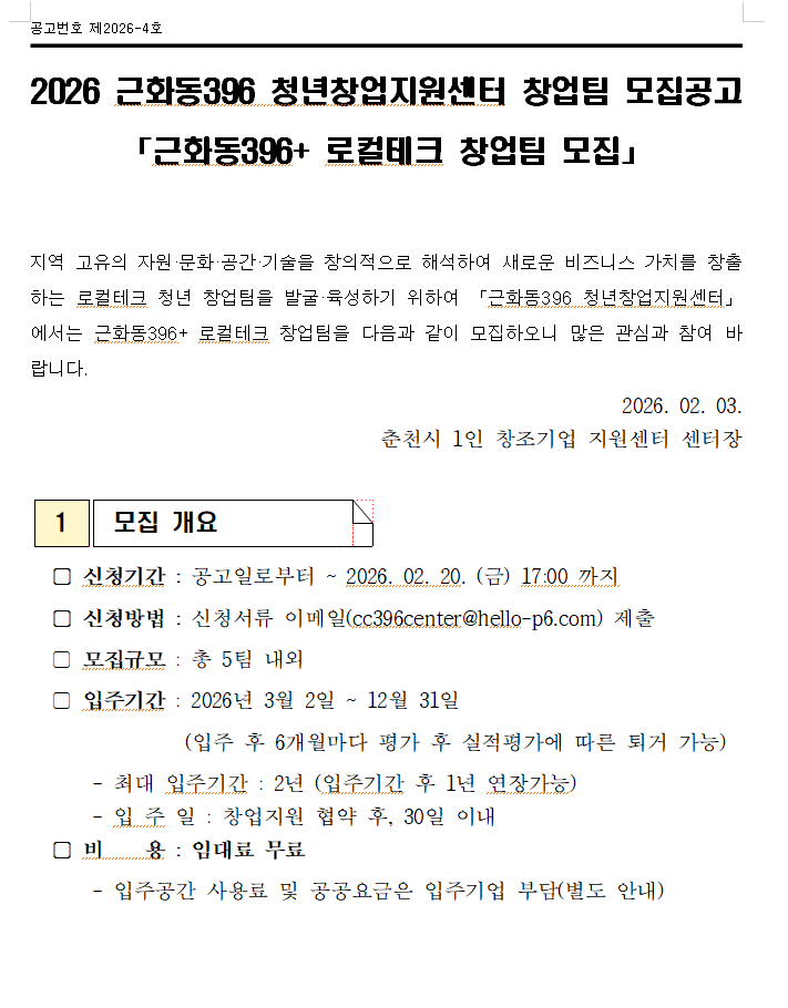 제2026-4호 [공고]근화동 396 청년창업지원센터 입주기업 모집 공고문(근화동396청년창업공간)_260202.hwp