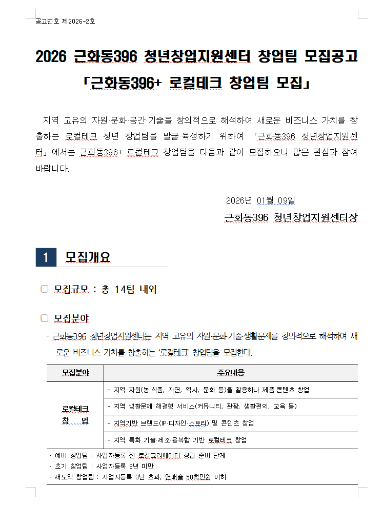 2026년 근화동396 청년창업지원센터 입주 기업 모집 공고(~01.26)